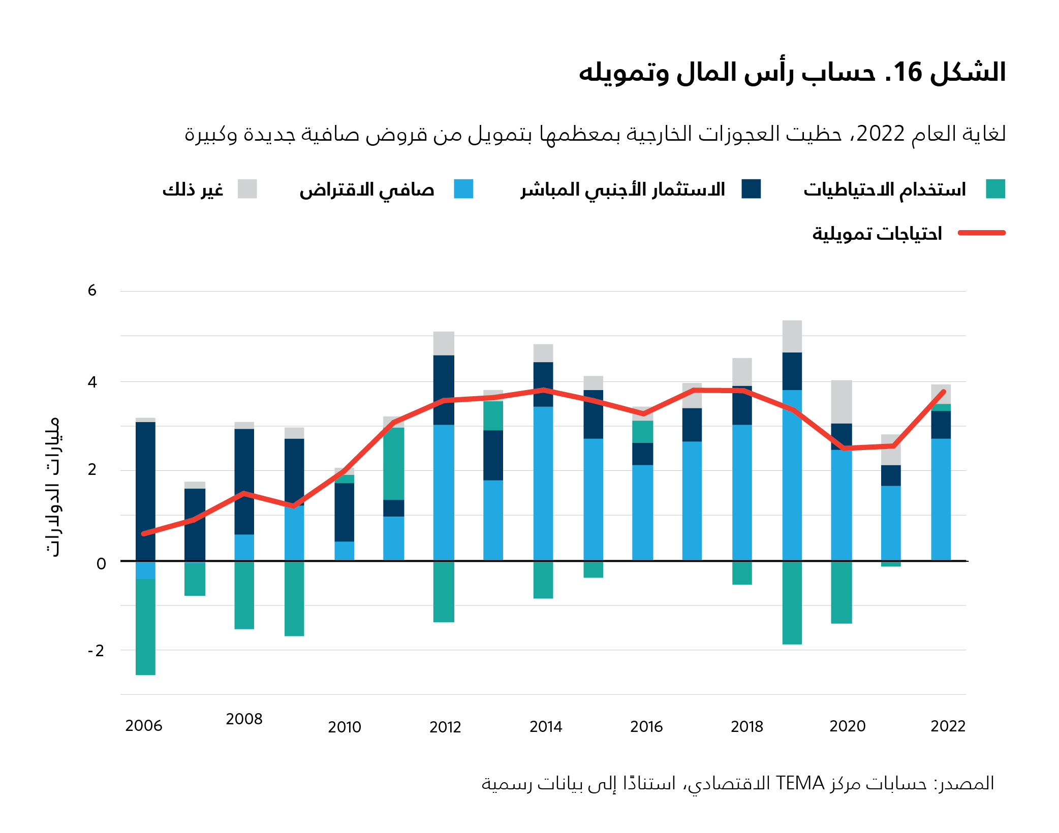 في العام 2010، حلّ صافي الاقتراض الخارجي مكان الاستثمارات الأجنبية المباشرة باعتباره المصدر الرئيس لتمويل عجز الحساب الجاري. لقد موّلت الاستثمارات الأجنبية المباشرة نحو 80 في المئة من عجز الحساب الجاري في المتوسط حتى العام 2010 (انظر الشكل 16). وتراجعت الاستثمارات الأجنبية المباشرة إلى نحو 0.5 في المئة من الناتج المحلي الإجمالي في العام 2022 (625 مليون دولار)، بعدما كانت 3 في المئة في العام 2010 (1.5 مليار دولار). علاوةً على ذلك، ازداد العجز الخارجي، الذي يعكس الاحتياجات التمويلية للبلاد، وجرى تمويله بصورة أساسية من خلال صافي الاقتراض الخارجي البالغ مليارَي دولار إلى 3 مليارات دولار سنويًا (انظر الشكل 16). وكانت التدفقات الرأسمالية الخارجية تأتي من المصارف الإنمائية المتعدّدة الأطراف، والجهات المانحة الثنائية، والأسواق المالية. ولكن بحلول العام 2022، انهار صافي التدفقات مع فقدان تونس النفاذ إلى أسواق سندات اليوروبوند.