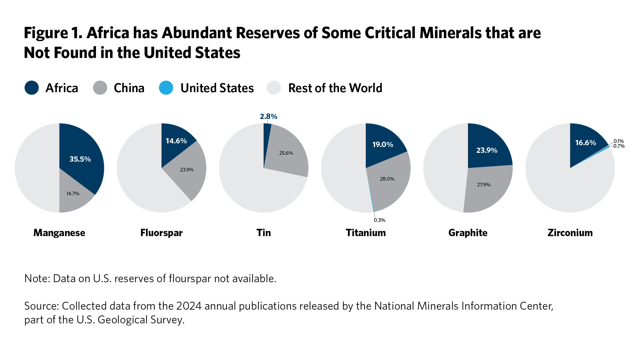 Mineral rich African countries arise as natural potential partners on both sides of this equation. With respect to inputs, taking copper as an example, the White House recently initiated a so-called “section 232” investigation to determine whether imports of copper—particularly from “a concentrated number of supplier nations”—pose a threat to national security.13 The concerns are not only over raw copper ore but also refined copper and concentrates. In 2024, China was responsible for an estimated 44 percent of global refined copper production, a far greater share than any other country.14 This was more than four times the refinery production from the Democratic Republic of the Congo (DRC) and Zambia combined, despite the fact that copper reserves in these countries are around two and a half times that of China’s reserves (and more than double that of the United States). Supporting the development of refining and processing capacity in the DRC and Zambia could therefore, alongside increased domestic production, help the United States alleviate its concerns around concentrated copper supply chains.
