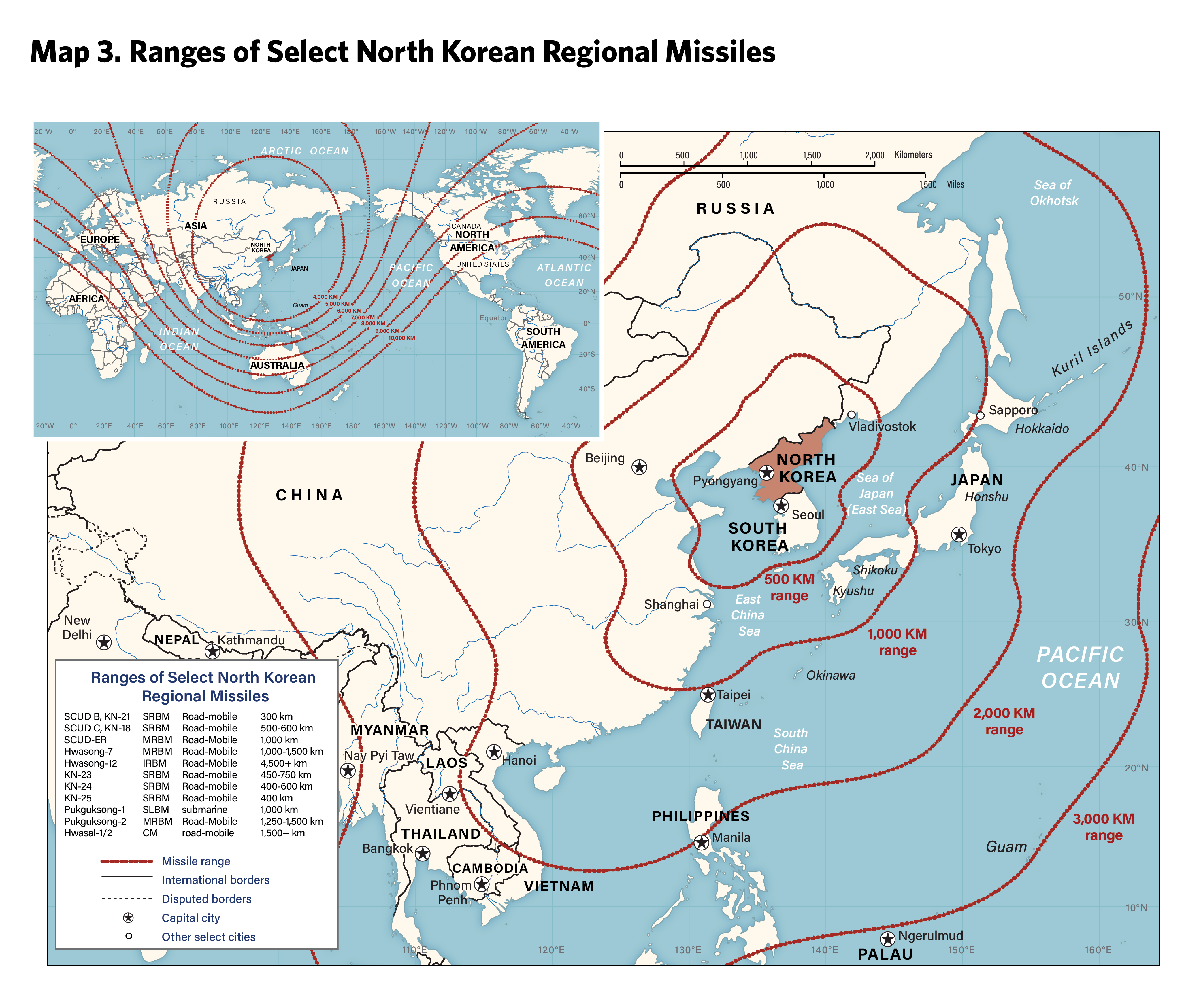 At the Eighth Party Congress of the Workers’ Party of Korea, Kim for the first time declared an intent to develop “tactical” nuclear weapons. No universal definition of tactical nuclear weapons exists, and Kim did not specify what he meant at the time.68 April 2022 was the first time North Korea demonstrated a delivery system that it ascribed a tactical nuclear delivery role to; the tested system was a close-range ballistic missile with a demonstrated range of 110 kilometers. Later that year, North Korea carried out a spate of missile launches that it described as operational exercises for units charged with tactical nuclear operations. These launches featured a spectrum of short-range ballistic missiles, medium-range cruise missiles, and one intermediate-range ballistic missile, suggesting that Pyongyang may be ascribing a tactical role to any missiles capable of ranging targets in the Indo-Pacific theater, including the U.S. territory of Guam (see map 3).