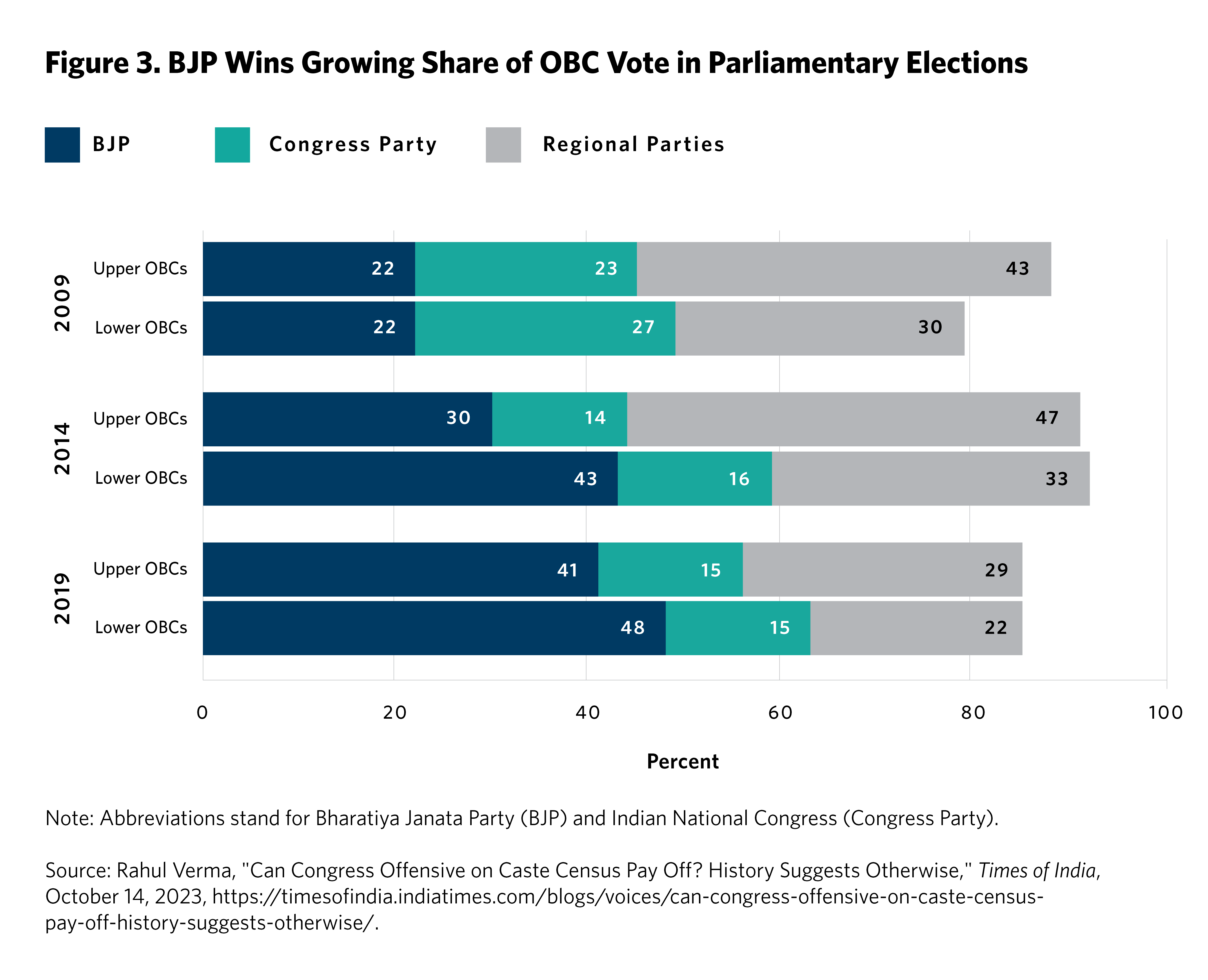 The third factor to consider is the battle over the allegiance of the Other Backward Classes (OBCs), the largest single voter bloc in India, likely accounting for more than 40 percent of the population. The electoral transformation of the BJP under Modi owes its success, in large measure, to the party’s ability to attract OBCs into its fold—snatching key voters away from the Congress Party and from the so-called Mandal parties in northern India, which mobilized on the basis of empowering backward castes.4 Hindi belt parties, like the Janata Dal (United) and Rashtriya Janata Dal in Bihar and the Samajwadi Party (SP) of Uttar Pradesh, shot to popularity thanks to their ability to cater to large segments of the OBC vote—until Modi’s arrival, that is. According to data collected by the Lokniti Programme for Comparative Democracy at the Centre for the Study of Developing Societies and analyzed by Rahul Verma, in the 2009 election the BJP captured 22 percent of the OBC vote (see figure 3). In 2014, under Modi (who happens to hail from the OBCs), the BJP made large inroads among this community.