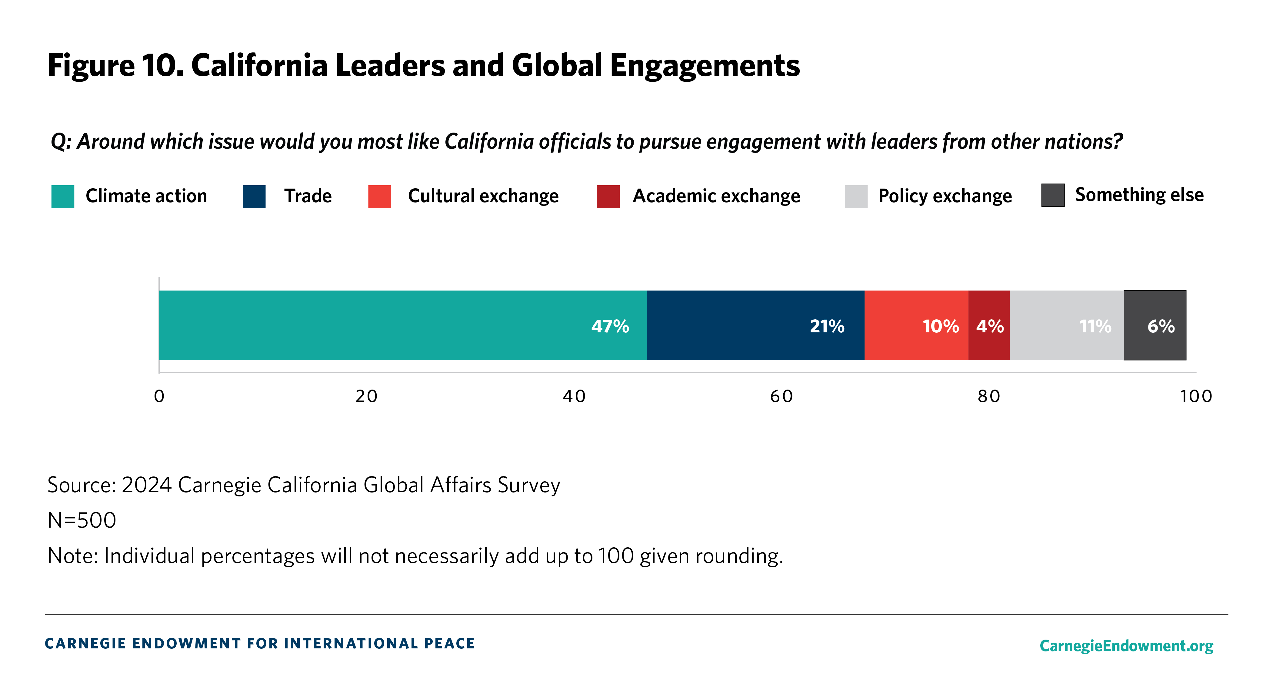 Newsom’s 2023 trip to China aligned with the priorities Californians identify for state-led international engagement. As figure 10 shows, when asked around which issue would you most like such engagement to occur, 47 percent identify climate action, 21 percent say trade, and 10 percent say cultural exchange.
