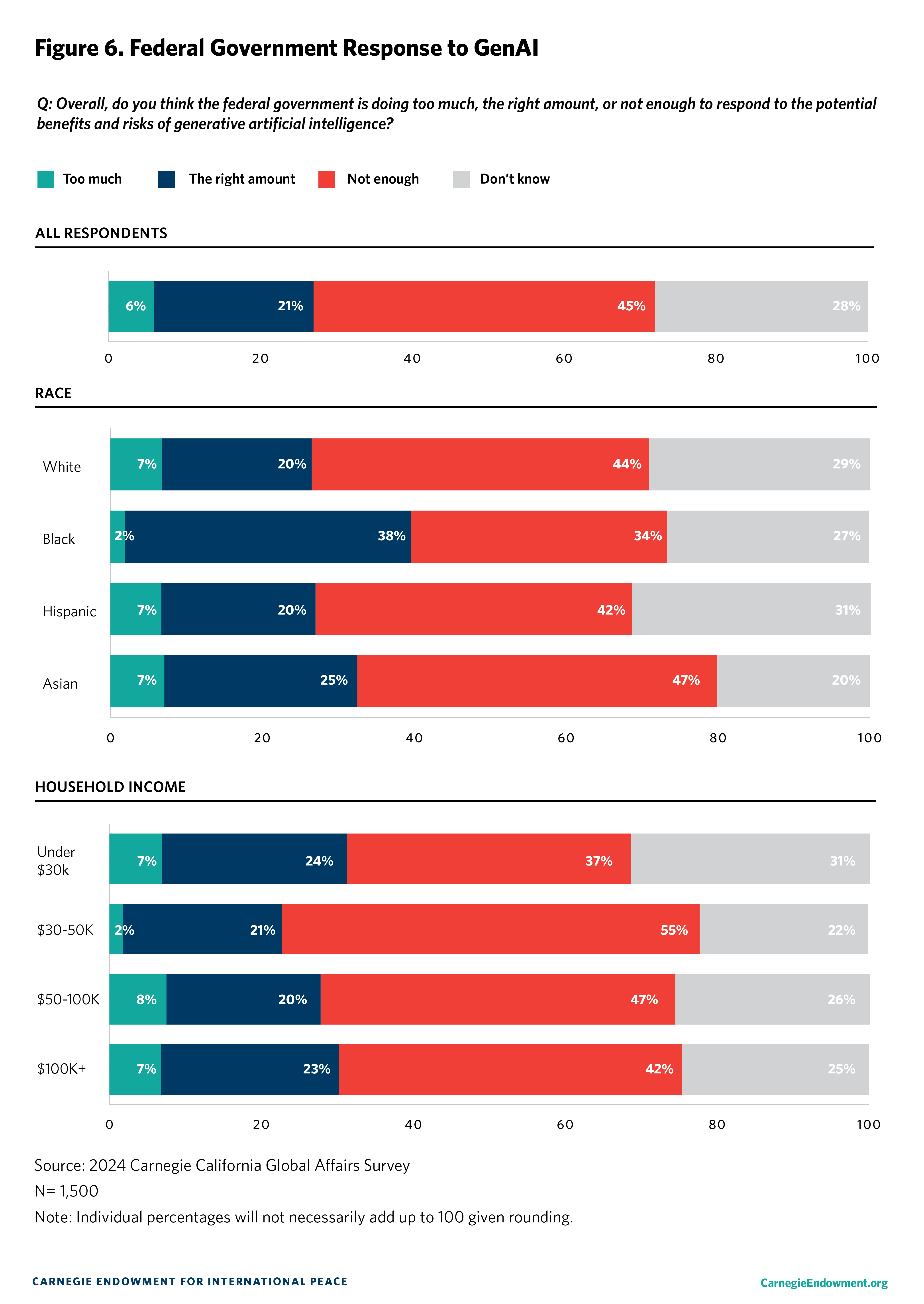 Moreover, 45 percent of Californians think that the federal government is “not doing enough,” 6 percent say it is doing “too much,” and 21 percent say it is doing “the right amount” to respond to the potential benefits and risks of AI. (Twenty-eight percent say they do not know.) Many Californians across partisan groups, demographic groups, and state regions say the federal government is not doing enough (see figure 6).