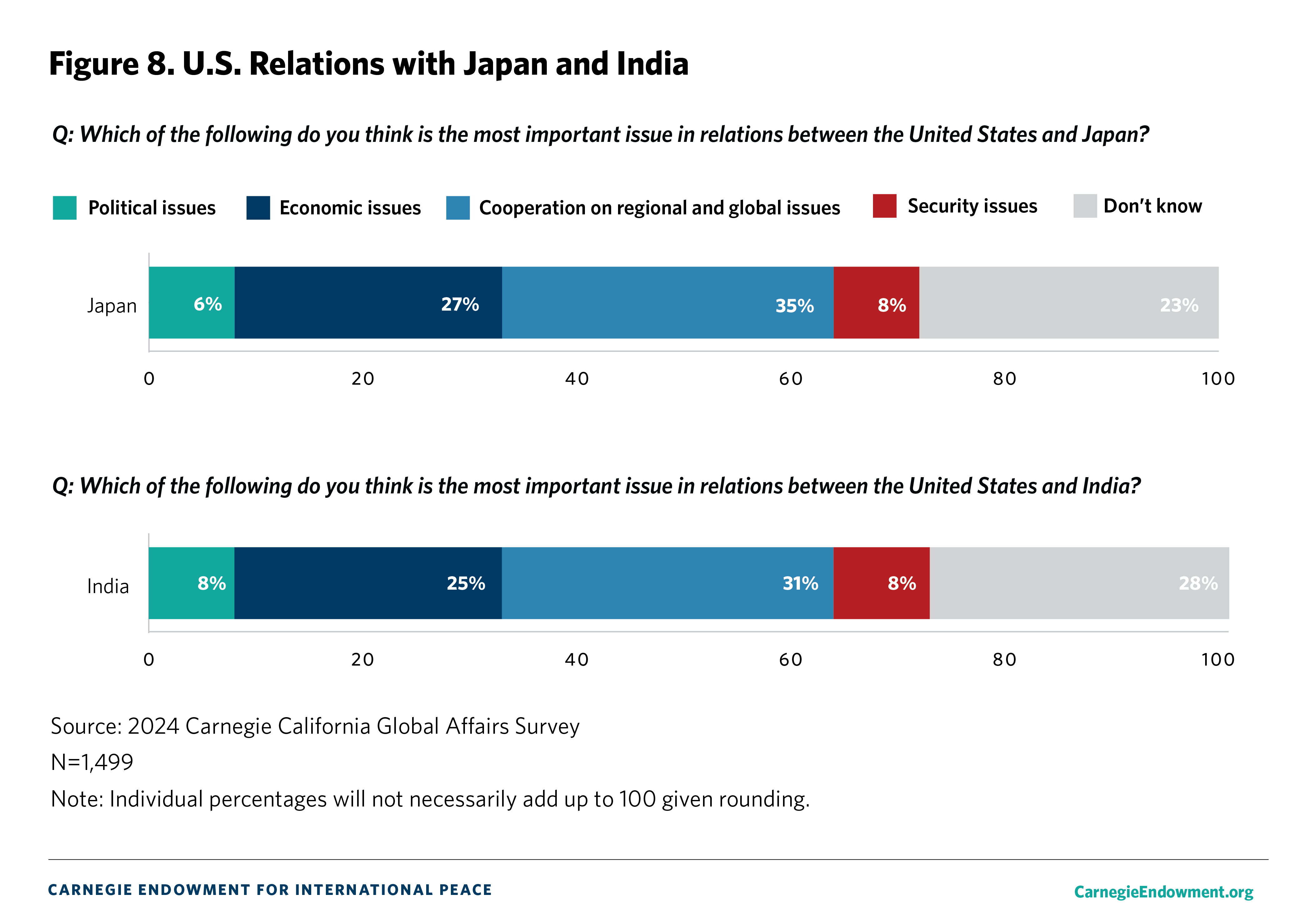 The overall margin of error is +/- 3.5 percent. The margin of error is calculated at the 95 percent confidence interval. We compare current Carnegie California Global Affairs Survey results to the 2023 Carnegie California Global Affairs Survey which was conducted with the same methodology and a number of national and regional surveys.1 The latter include surveys from the Chicago Council on Global Affairs (2023),2 Pew Research Center (2022),3 the Public Policy Institute of California (2001),4 the Carnegie Endowment for International Peace (2022 and 2023),5 and Gallup (2024).6